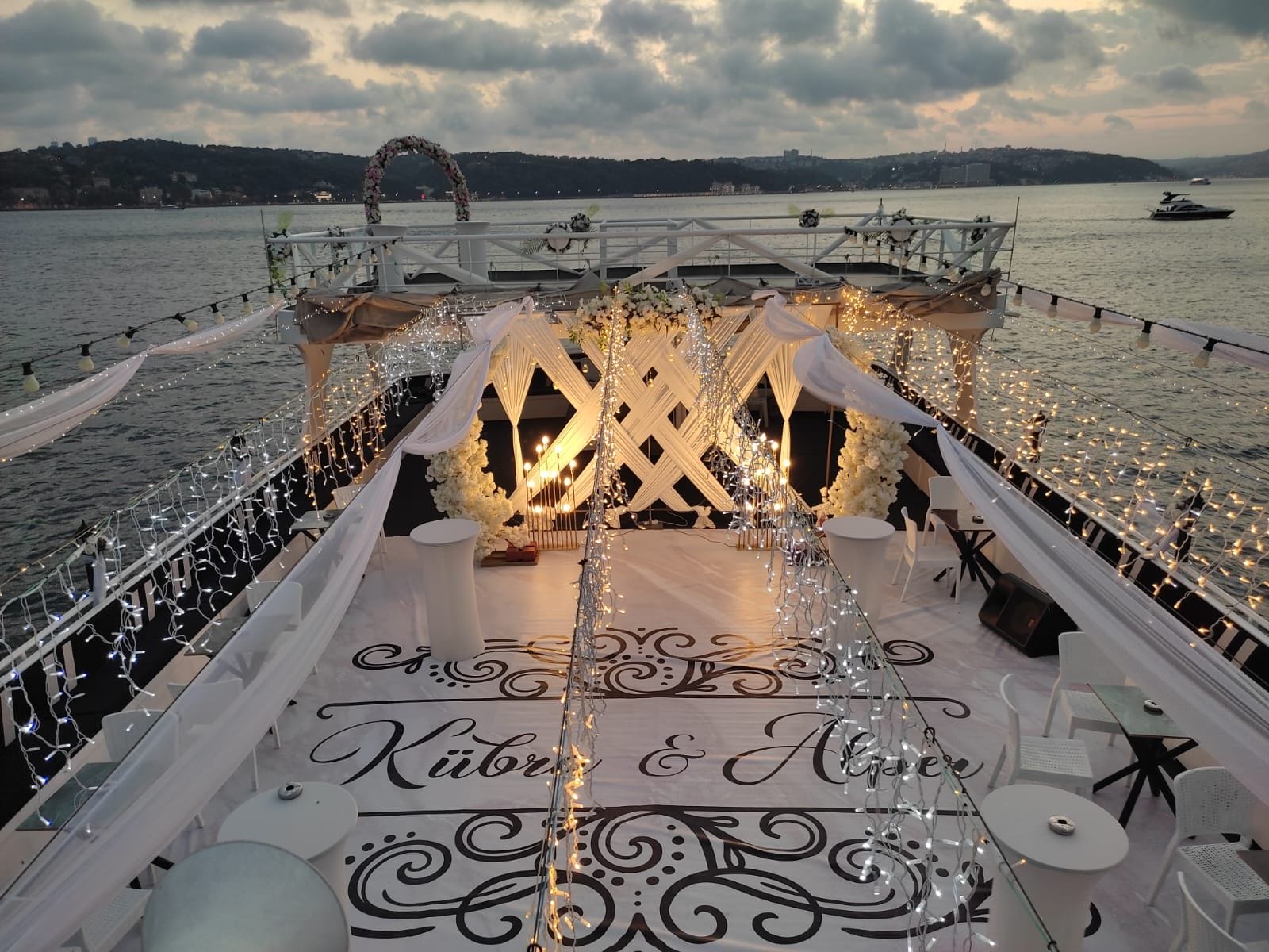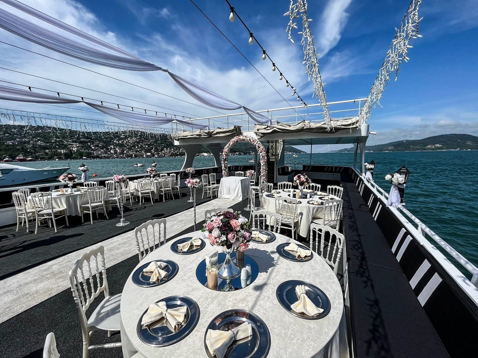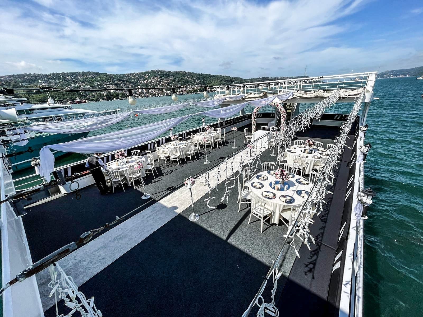 İstanbul Boğazı'nın eşsiz manzarasında düğün, nişan ve özel kutlama organizasyonları için tercih edilen bu tekne, kapalı ve açık güverte alanlarıyla her ölçekte organizasyona uyum sağlar. En özel günlerinizi unutulmaz kılmak için tüm teknik altyapı ve ikram olanakları hazır beklemektedir.