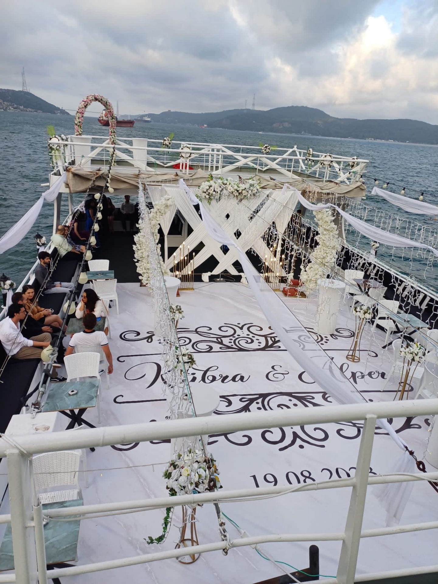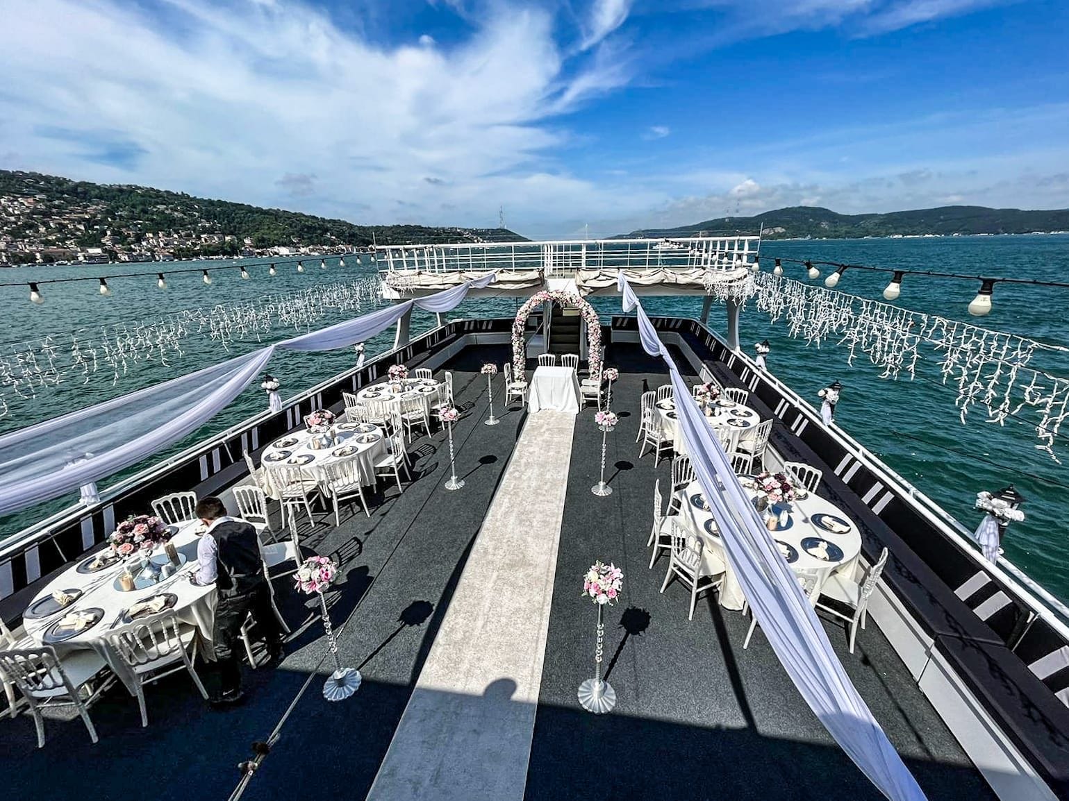 Bu tekneyi çiftlerin özel organizasyonu için rezerve etmek, kapasite ve fiyat bilgisi almak üzere Teknede Düğün ekibiyle iletişime geçin. Yıllık deneyimimiz ve kapsamlı tekne filomuzla özel düğün etkinliğinizi İstanbul Boğazı'nda hizmetinize sunmaktan memnuniyet duyarız.
